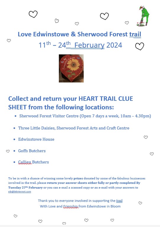 Follow Edwinstowe in Bloom’s Trail of Hearts ‘Love’ingly created by people within our local community taking in Edwinstowe High Street, Edwinstowe Village Hall, St Marys Church, Forest corner the Arts & Craft Centre and Sherwood Forest Visitor Centre.